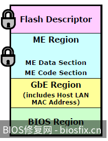 描述符区:位于芯片起始位置,由Intel管理引擎使用,定义了芯片区域的访问权限(如读/写锁定)。