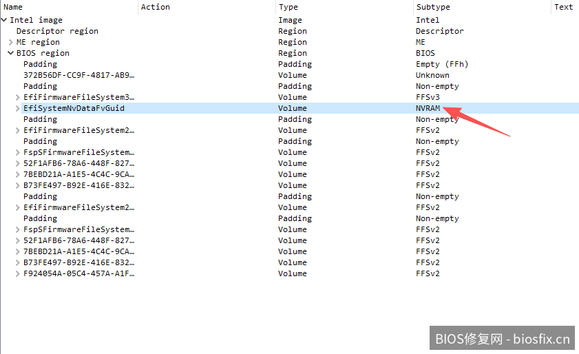 2、使用UEFITool打开BIOS文件并找到NVRAM模块。