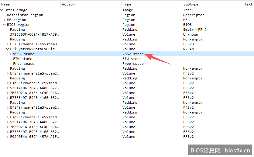 3、展开NVRAM模块并找到其中的VSS/VSS2(可变存储服务)区域。
