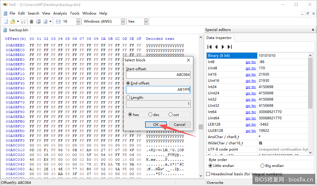 4、使用HxD打开BIOS文件并选择VSS/VSS2区域的主体部分。