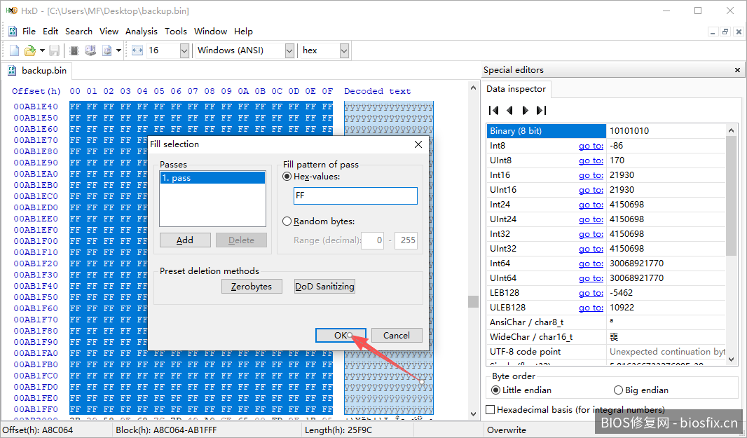 4、将VSS/VSS2区域的主体部分填充为00或FF(一般情况下只需填充第一个VSS/VSS2区域即可)。